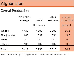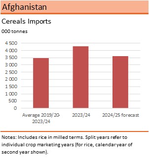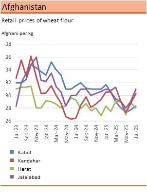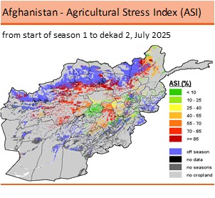 Harvesting of the 2025 winter wheat crop, accounting for the bulk of annual production, finalized last June. Overall production is estimated at a below‑average level due to low cumulative precipitation amounts from October 2024 to March 2025 and elevated temperatures, which resulted in reduced sowings and negatively affecting yields, especially in rainfed areas. Reportedly, some farmers were able to partially mitigate the effects of the rainfall deficits by accessing groundwater resources and, in certain areas, by benefiting from improved access to quality agricultural inputs provided by FAO. Planting of the 2025 spring wheat crop, to be harvested from August, finalized last April, while planting of maize and rice crops finalized in June. Dry weather conditions have prevailed since the start of the season in March, affecting planting operations and early crop development. Remote sensing data (see ASI map) as of mid‑July 2025 indicated particularly poor crop conditions in the northern, central and some southern provinces. Additional rainfall is urgently needed in the coming weeks to prevent significant declines in the production of 2025 spring wheat, rice and maize crops.