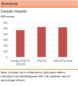 More than half of domestic needs of cereals are covered by imports, mainly from the Russian Federation. Cereal import requirements in the 2025/26 marketing year (July/June) are forecast at an above‑average level of 500 000 tonnes. Wheat imports, which account for most of the total cereal purchases, are forecast at an above‑average level of 400 000 tonnes. On 26 June 2025, the government introduced a six‑month ban on exports of grains (wheat, barley and maize), with the aim to increase local supply and improve national food security.