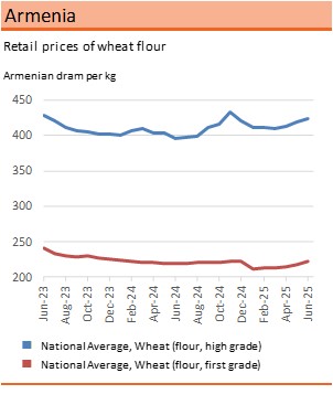 The harvest of 2025 winter crops, primarily wheat, began in July in Ararat Valley, while the harvest of 2025 spring crops, mainly barley, also started in July. Average precipitation amounts and near‑average temperatures since May, coupled with adequate availability of irrigation water, had a positive impact on vegetation conditions across the country, particularly in parts of the western provinces of Armavir and Aragatsotn, where about 20 percent of the annual wheat output is produced. The 2025 aggregate cereal production is forecast at 230 300 tonnes, about 1.5 percent above the average level.