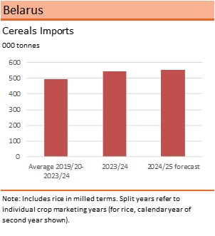 In the 2024/25 marketing year (July/June), total cereal import requirements are forecast at about 540 000 tonnes, above the five