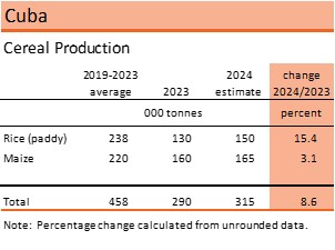 Harvesting of the 2024 main paddy and maize crops is nearing completion and production is estimated at below-average levels. Although the results of the impact assessment of the two hurricanes on agriculture are not yet available, it is reported that 835 hectares of rice and 571 hectares of maize have been affected in Atemisa and Mayabeque provinces in November 2024 and losses are expected to be significant. The paddy planted area in 2024 is estimated at a below-average level due to lack of agricultural inputs and high production costs coupled with dry weather conditions and above‑average temperatures in April and May 2024. However, above‑average rainfall amounts in June and July restored conducive conditions for crop development in the main paddy producing areas of Granma, Sancti Spíritus, Camagüey and Pinar del Río. Harvesting of the main maize season crop in underway and production is anticipated to be below average as the reduction of planted area more than offset the above‑average 2024 yields from the improved availability of locally produced fertilizers.
