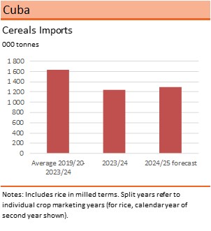 Cereal import requirements in the 2024/25 marketing year (July/June) are forecast at 1.3 million tonnes, about 15 percent below average, reflecting weak local demand from the feed industry and for food consumption due to the reduced size of the population, that has been declining since 2016. However, imports of rice, which account for the largest share of cereal imports, are anticipated at an above-average level of 482 000 tonnes to compensate for crop losses in the areas affected by the hurricanes. In 2023/24, cereal imports were about 16 percent below the average level as low availability of foreign exchange reserves limited the country’s capacity to import.