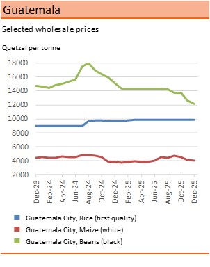 From October to December 2025, prices of white maize declined by more than 10 percent due to ample market availability from the main season Primera harvest as well as higher year‑on‑year imports during this period. However, prices in December 2025 were 6 percent higher than a year before, as a result of the lower year‑on‑year outturn in 2025. After remaining stable during the first semester of 2025, wholesale prices of black beans slightly declined from July to December 2025, in line with improved seasonal availability from the minor season harvest, as well as declining international quotations. Prices of black beans in December 2025 were about 20 percent lower year‑on‑year due to large market supply from above‑average imports in both 2024 and 2025. Rice prices were mostly stable from March to December 2025, but moderately above their levels of the previous year, reflecting lower year‑on‑year imports.