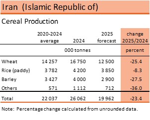 Total cereal production in 2025 is estimated at about 20 million tonnes, nearly 10 percent below the five-year average. Harvest of the 2025 winter wheat was completed last July, with production estimated at 12.5 million tonnes, about 12 percent below the average mainly due to prolonged dry weather conditions throughout the season. Cereals are largely rainfed, making production highly dependent on rainfall volumes. Between December 2024 and May 2025, rainfall amounts were below the average through most producing areas, adversely affecting yields. In key producing province of Khuzestan, very low temperatures in late February during flowering and grain-filling stages damaged crops. Frequent power outages, particularly in irrigated areas, constrained farmers’ access to irrigation water. In addition, farmers faced challenges in securing inputs due to high prices of seeds and fertilizers.