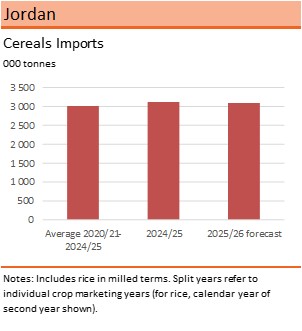 Cereal import requirements for the 2025/26 marketing year (July/June) are preliminarily forecast at 3.1 million tonnes, about 3 percent above the five‑year average, reflecting the country’s high reliance on imports, which on average cover nearly 70 percent of annual domestic consumption. The country also maintains strategic wheat and barley stocks equivalent to about ten and eight months, respectively, of local consumption with the aim to mitigate potential disruptions of the global supply chain.