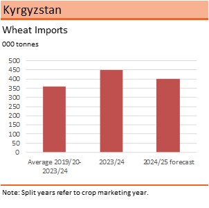 In the 2024/25 marketing year (July/June), wheat import requirements are forecast at a near-average level of 350 000 tonnes. Wheat imports account, on average, for 95 percent of total annual cereal imports and cover almost half of the domestic needs of wheat for food consumption and milling purposes.