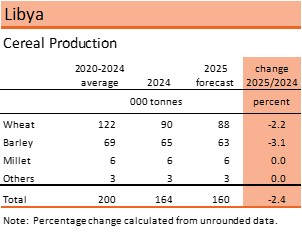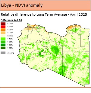 Winter cereal harvest was completed by June 2025, while the spring millet harvest concluded in August. Total cereal production is estimated at 160 000 tonnes, about 20 percent below the five‑year average, largely driven by adverse weather conditions, which affected yields of winter cereals. In key producing regions of the northwest, heavy rainfall in December 2024 caused floods and severely damaged crops. Similarly, in northeastern provinces of Al Fatah and Benghazi, early season floods affected crops in some areas. According to FAO remote sensing Normalized Difference Vegetation Index (NDVI), vegetation conditions as of April 2025 infer likely unfavourable crop prospects. In addition, the 2025 cereal output was undermined by localized conflicts which disrupted agricultural activities and by limited farmers’ access to inputs due to their high prices.