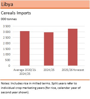 Cereal import requirements for the 2025/26 marketing year (July/June) are preliminarily forecast at 3.2 million tonnes, about 6 percent above the average. Wheat imports, which account for a large portion of total cereal imports, are forecast at 1.5 million tonnes, about 12 percent above the average. The country’s capacity to import is highly driven by the availability of foreign currency derived from oil exports.