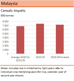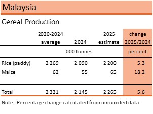 Aggregate paddy crop production in 2025 is estimated at a below-average level of 2.2 million tonnes, mainly due to heavy rains and floods in late 2024 which disrupted planting operations of the main season paddy crop, especially in Peninsular Malaysia. Aggregate maize crop production in 2025 is estimated at an average level of 65 000 tonnes.