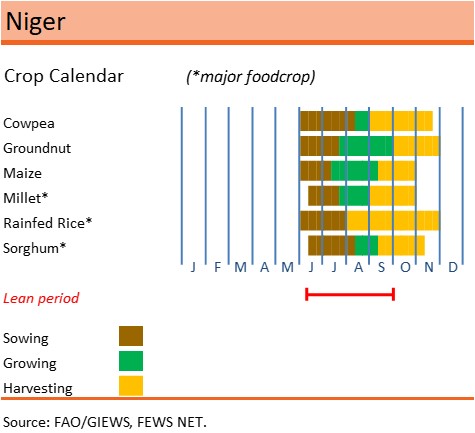 Harvesting operations of the 2025 rainfed coarse grain and first rice crops were completed in November 2025, while harvesting of the second rice crop, grown under irrigation in the regions of Dosso and Tillabéri, is underway and will conclude by the end of January 2026. The rainy season, which usually extends from June to September, was characterized by a mixed start. In several areas, early season dryness in June affected planting operations and crop establishment, requiring some replanting. However, weather conditions improved in July, with above‑average cumulative precipitation amounts through September boosting yields across the country. Minor crop losses occurred in localized areas from flooding in August and September, as well as from hailstorms and pest outbreaks.
