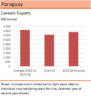 Cereal exports in the 2025/26 marketing year (July/June) are anticipated at 3.9 million tonnes, about 5 percent below the previous five‑year average level. This is mostly due to reduced demand for maize from Brazil, the country’s main importer, following its ample domestic supply from the record 2025 harvests. By contrast, exports of wheat and rice are forecast at an above‑average level, reflecting the abundant exportable surplus due to an above‑average production in 2025.