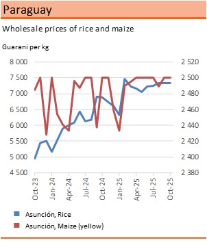 Wholesale prices of rice have been stable between June and October 2025, when they were 6 percent higher year‑on‑year due to strong export demand. Prices of yellow maize have been generally steady since May 2025 at similar year‑earlier levels, reflecting an adequate market supply.
