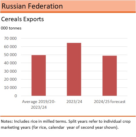 Total cereal exports in the 2024/25 marketing year (July/June) are forecast at about 50 million tonnes, close to the five