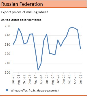 Export prices of milling wheat showed a declining trend between January and March 2024, reflecting large domestic availability. Between April 2024 and April 2025 export prices for milling wheat increased, then slightly declined in May, but remained, as of June 2025, 5 percent above the previous year’s level primarily due to declining market availabilities.