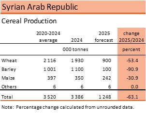 Cereal harvest was concluded in July 2025 and production is estimated at 1.2 million tonnes, more than 60 percent below the average, largely due to severe drought conditions and high temperatures. Cumulative rainfall amounts between November 2024 and May 2025 were more than 50 percent below the average, the lowest level recorded during the last ten years. According to remote sensing geospatial data, the Vegetation Health Index (VHI) in May 2025 indicated vegetation conditions well below average in key producing regions of Aleppo, Raqqa and Hassakeh. In addition, domestic unrest during the planting period, between November and December 2024, which hampered farmers’ access to fields, and high production costs, including fuel, seeds and fertilizers, contributed to a reduction in the area planted.