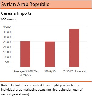 Wheat import requirements for the 2025/26 marketing year (July/June) are preliminary forecast at 3 million tonnes, about 70 percent above the five‑year average, reflecting two consecutive years of below‑average output. While international financial restrictions were partially eased in May 2025, economic uncertainty, local currency fluctuations and domestic unrest raise challenges to securing foreign currency reserves required to buy key cereal commodities on international markets.