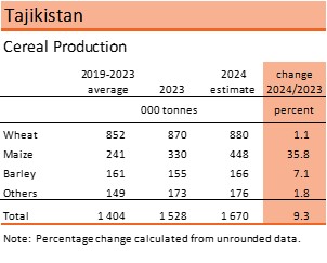 Harvesting of the 2024 winter cereal crops was completed in August 2024 (considering agro‑climatic zones) , while harvesting of maize and other spring crops finalized between September and November 2024. The 2024 aggregate cereal output is estimated at 1.8 million tonnes, including 880 700 tonnes of wheat, 448 801 tonnes of maize and 166 380 tonnes of barley. The total production is above the five‑year average levels, following favourable weather conditions during the season and near-average plantings.